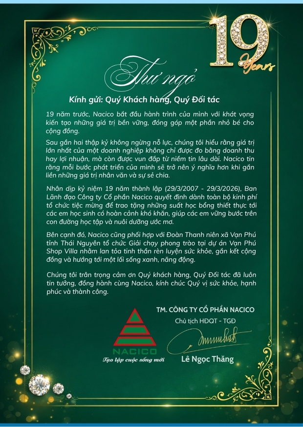 Tin tức mới nhất Vạn Xuân Villa hưởng lợi từ loạt dự án hạ tầng giao thông mới 03/12/2026 13:29:11 Thái Nguyễn dẫn đầu cả nước về thu hút FDI đầu năm 2026 03/11/2026 09:42:11 Thái Nguyên - Điểm đến hấp dẫn 08/17/2024 08:13:34 Tạo thêm sức hút cho du lịch Đại Từ 08/12/2024 10:19:50 Tags Bất động sản Thái Nguyên Cam kết đồng hành lâu dài Chung tay vì cộng đồng phát triển bền vững Chương trình ý nghĩa vì cộng đồng Công ty Nacico chung tay xây dựng nhà ở cho hộ nghèo tại huyện Đại Từ GặpMặtDoanhNghiệp Hỗ trợ kinh phí xây dựng nhà ở HợpTácThànhCông HuyệnĐạiTừ Khởi công khu đô thị Hoàng Gia Khu đô thị Hoàng Gia Nacico Nhà đất Đại Phúc Thái Nguyên Nhà đất Thái Nguyên PhátTriểnBềnVững Vai trò của Nacico trong chương trình XuânẤtTỵ2025 THƯ NGỎ 03/23/2026 15:17:55 Đăng bởi NACICO (0) bình luận Chia sẻ: Tin tức liên quan NACICO BÀN GIAO "SỔ ĐỎ" ĐỢT 1 DỰ ÁN VẠN PHÚ SHOP VILLA 04/20/2026 13:15:50 CÔNG BỐ THÔNG TIN VỀ NĂNG LỰC ĐỦ ĐKHĐ THÍ NGHIỆM CHUYÊN NGÀNH XD 04/14/2026 09:35:42 MỞ BÁN CHÍNH THỨC DỰ ÁN VẠN PHÚ SHOP VILLA 04/06/2026 16:57:03
